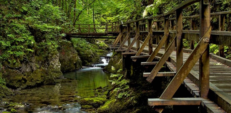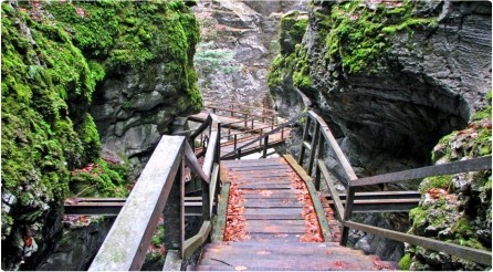 Water is consumed for millennia stone to prokrocila this passage striking power of the elements of water and wildness of the rugged rocks . Above him on the metal bracket cut into the rocks are made bridges and stairs that goes . There only mid-summer to pan affluent places briefly reaching solar rays . Rocks are in places covered with moss , and the terraces on which the moving quarry , najcšce chamois has grass and trees .